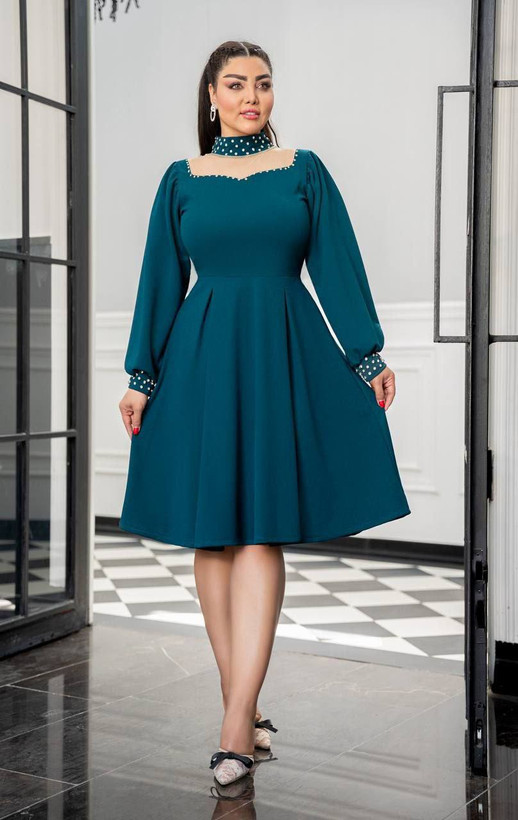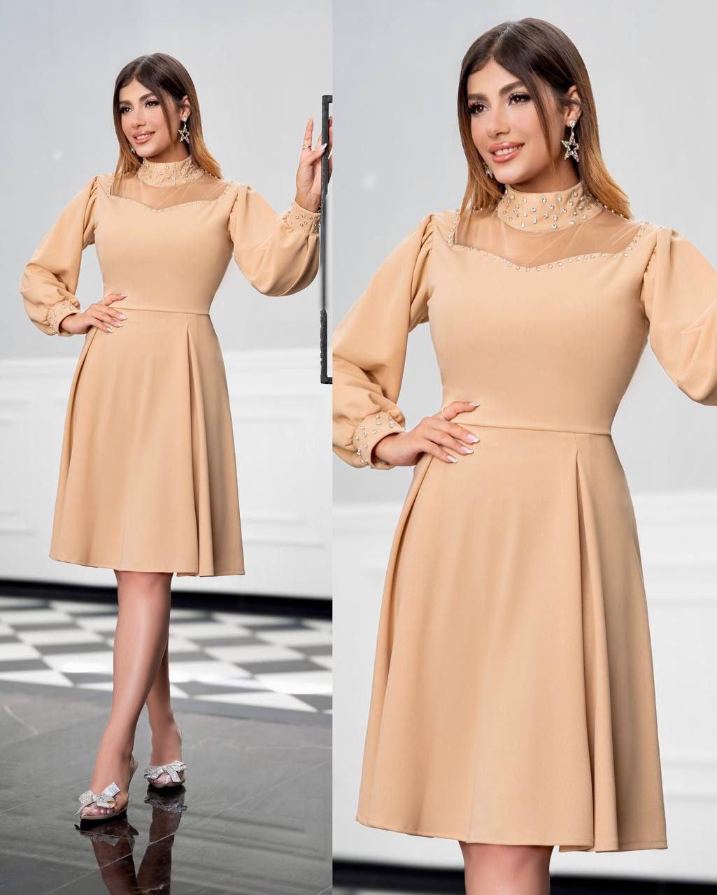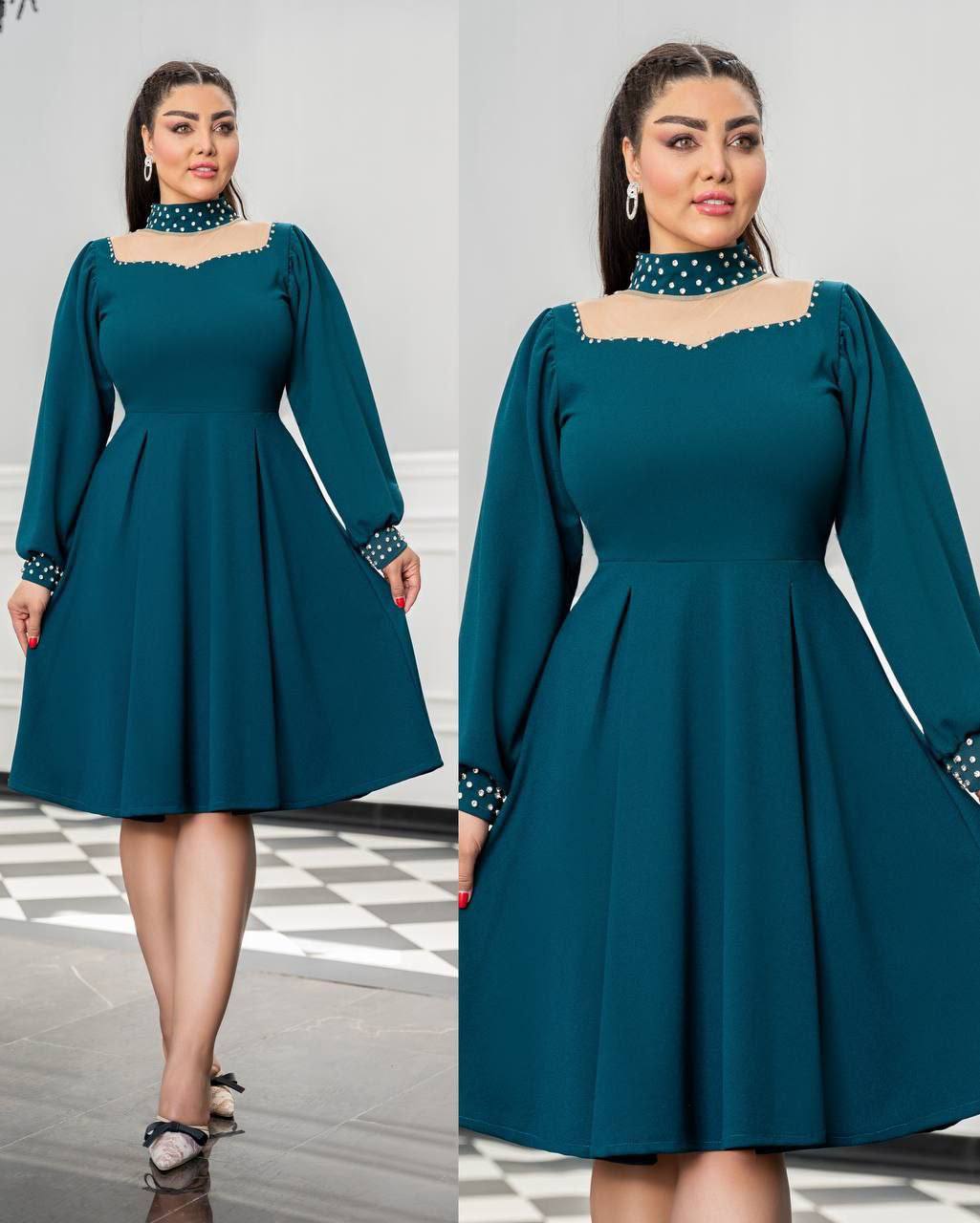 طراحی این لباس با تمرکز بر جزئیات خیرهکننده انجام شده است. یقه ایستاده و مچهای آستین با نگینهای درخشان تزئین شدهاند که نیاز شما به اکسسوریهای اضافه را به حداقل میرساند. برش دامن این کار به صورت کلوش با پیلیهای ظریف است که علاوه بر راحتی در حرکت، ظاهری کلاسیک و اشرافی به لباس داده است. قد دامن تا روی زانو (میدی) طراحی شده که برای انواع مراسم رسمی و نیمهرسمی مناسب است.